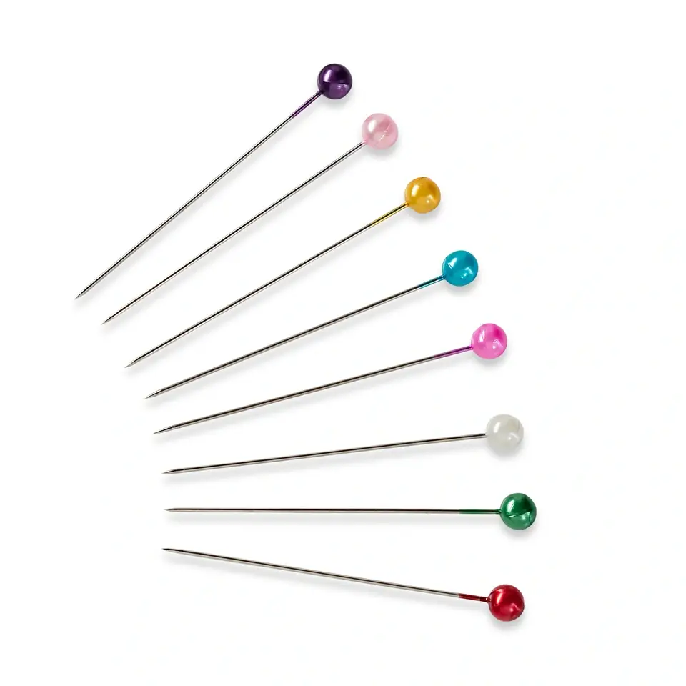 These pins are equipped with pearl-like, shiny heads made of plastic in many different colours. The pearl-headed pin’s smooth stem, made of hardened steel, can neither break nor bend due to its balanced spring stiffness. Its fine tip easily penetrates any fabric, thereby going easy on the fibres. The striking pearl heads ensure that the nails are well-visible, which ensures that no nails remain in the clothing after sewing the pinned work pieces. Prym offers pearl-headed pins in size 40 mm x 0.58 mm in a plastic canister with gold or silver or colour-sorted heads.