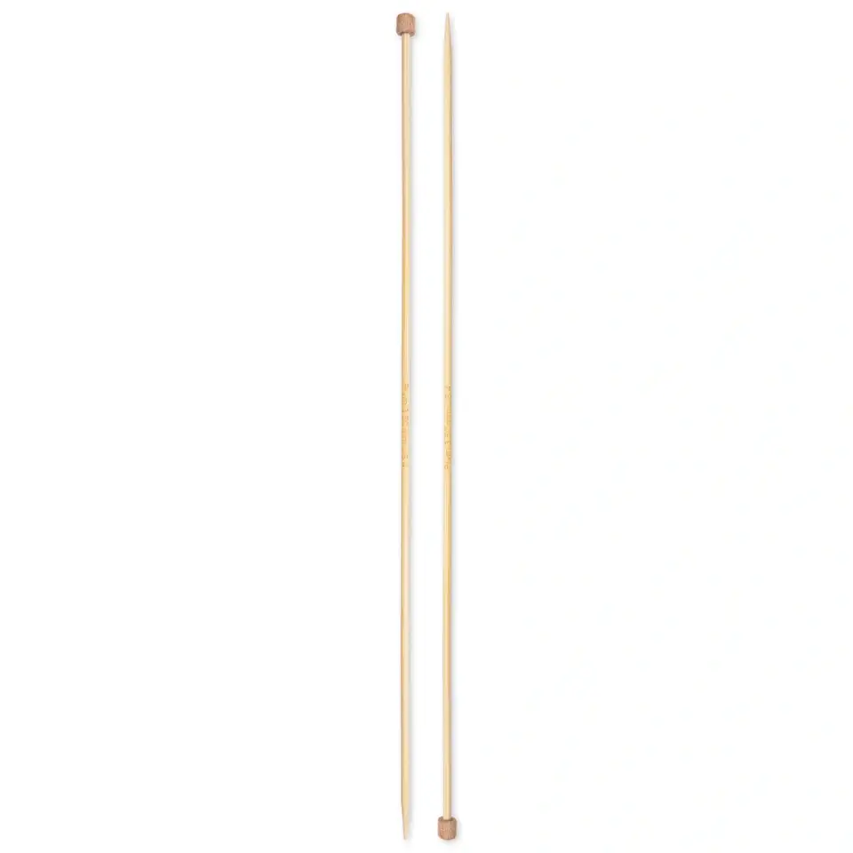 Feel like making an elegant knitted pullover or a cosy jacket? The pleasant, warm feel of these single-pointed knitting needles made from light bamboo and their smooth, non-slip surface makes knitting a pleasure; they are just perfect for working longer sessions on a project. Despite being very sturdy, they are very flexible. The points are precision-shaped, are not fibrous and allow the needle to be inserted with ease into each stitch without splitting the yarn. The knob at one end of the needle also prevents the stitches from slipping off the needle. The needle gauge of these 33 cm long single-pointed knitting needles is printed centrally on the needle for ease of reading. Where sustainability is concerned, the single-pointed knitting needles score not only because they are made from quickly regrowing, Chinese bamboo, but also because of their environmentally- friendly manufacturing process and the plastic-free packaging. Because they are made from natural material they are ideal for allergy sufferers.